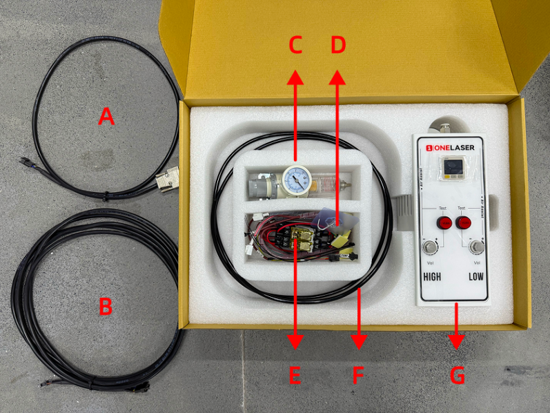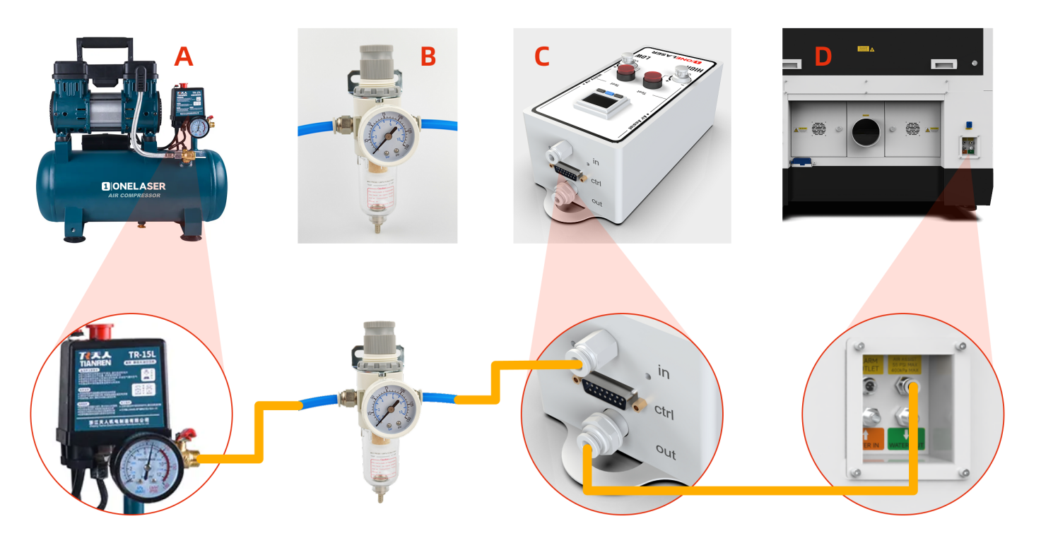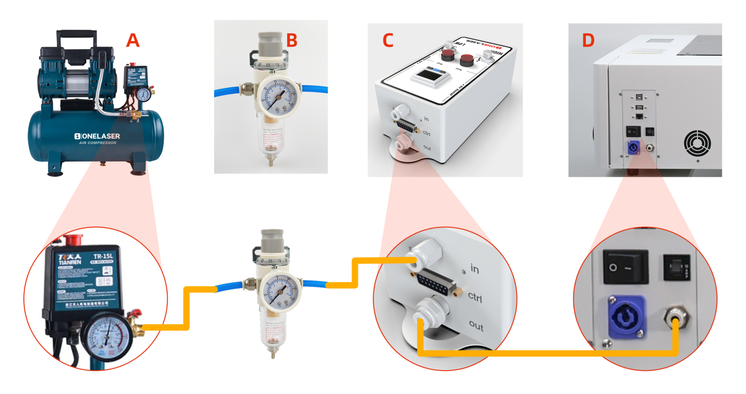 All accessory installations must comply with ONELASER technical specifications to ensure proper operation of the Air Assist Control system. Failure to comply will result in: performance degradation, reduced service life, increased maintenance costs and even permanent equipment damage.