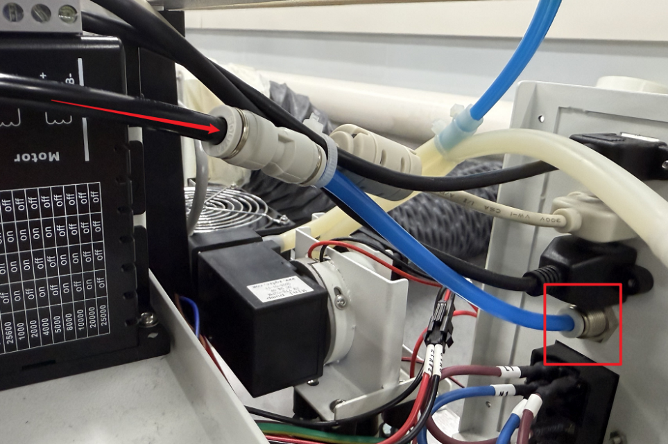 The air assist system automatically activates / deactivates when the laser equipment is started / shut down. If the laser equipment has no active processing task, the air assist system stops air supply.