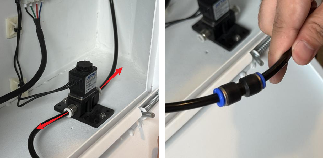 4. Open the small access door/panel on the left side of the device. Pull the connector through this opening towards the Air Assist Kit. Plug the connector into the port labeled "Ctrl" to complete the circuit connection.