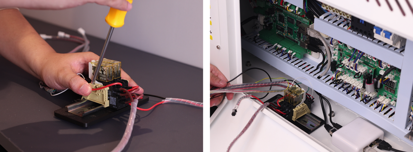 2. Locate Control Cable 1 (DB9 Female) and Control Cable 2 (5-Wire Port) inside the air assist control box. First, mate the two cables together to extend the overall length – we will refer to this combined cable as the "Assembled Cable". Then, connect the 5-Wire Port end of the Assembled Cable to the 5-Wire Port on the relay, as shown in the figure below.