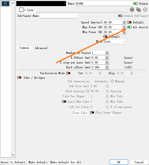Typically, higher air pressure is used for cutting operations, while lower pressure yields better results for engraving operations. You can adjust the air pressure to meet specific requirements via manual knob adjustment or by changing the air assist mode in your design.