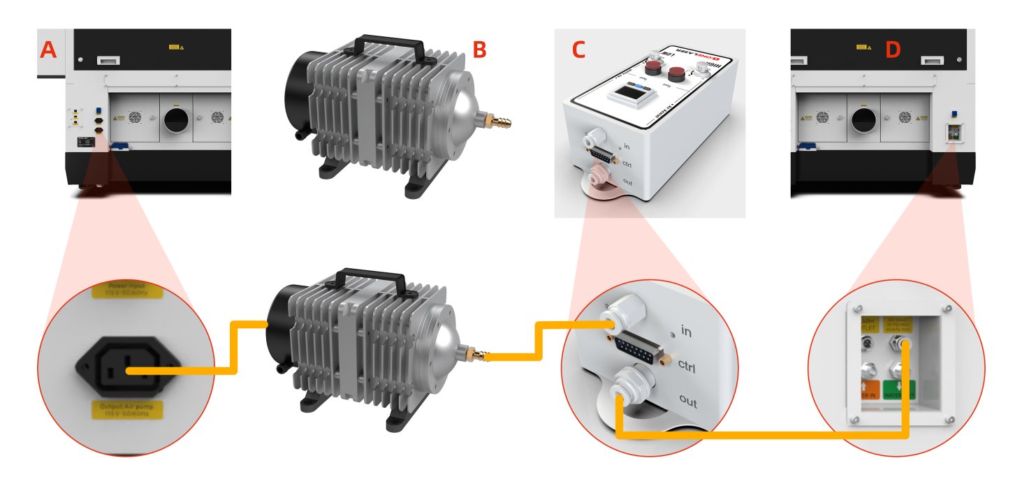 Note: The original air pump delivers lower output pressure, making it suitable for limited scenarios (e.g., thin sheet cutting). For processing a wider range of materials, using an external air compressor system is recommended for significantly improved processing results. Optimized gas source solutions and test data will be continuously updated on the official website. Stay tuned for updates.