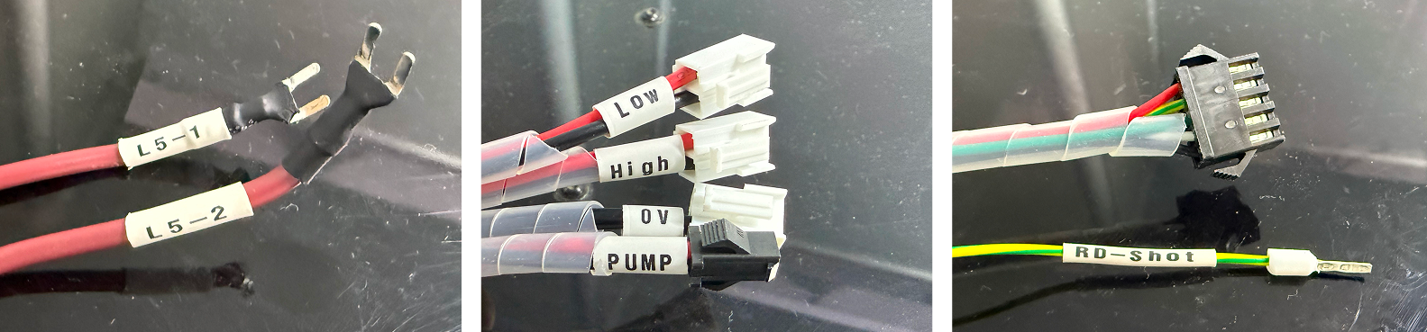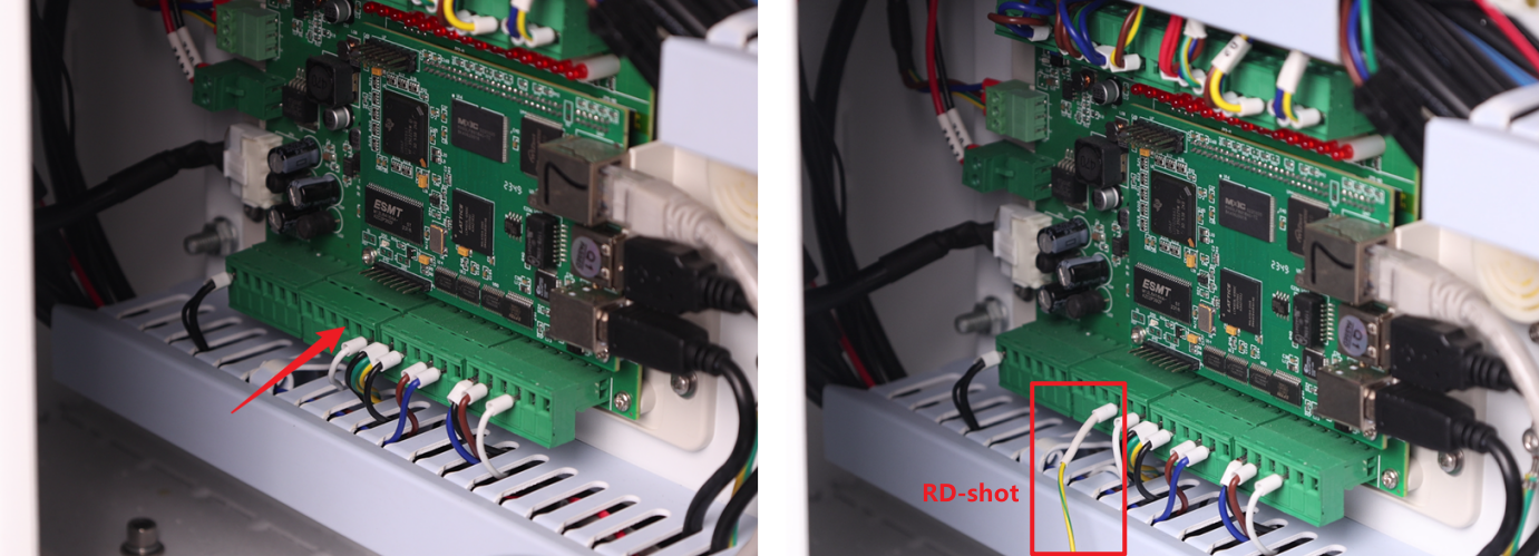 1. Locate the wire labeled RD-shot. Plug it into the 4th small terminal of the 2nd large terminal block located the bottom-left section of the TL Mainboard.