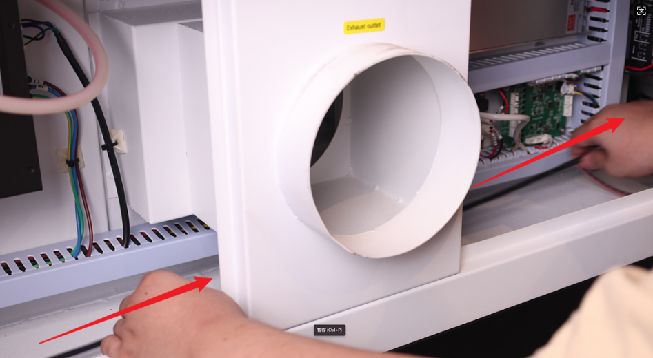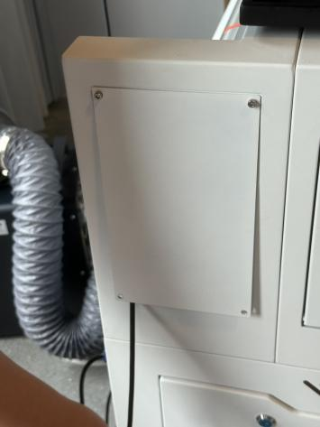 4. Open the small access door/panel on the left side of the device. Pull the connector through this opening towards the Air Assist Kit. Plug the connector into the port labeled "Ctrl" to complete the circuit connection.