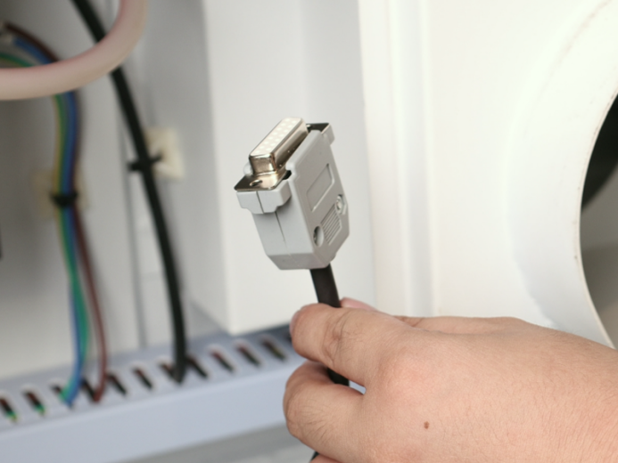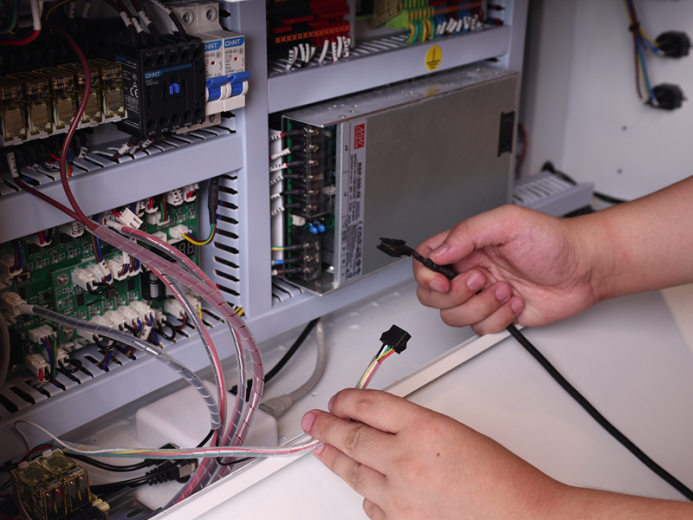 2. Locate Control Cable 1 (DB9 Female) and Control Cable 2 (5-Wire Port) inside the air assist control box. First, mate the two cables together to extend the overall length – we will refer to this combined cable as the "Assembled Cable". Then, connect the 5-Wire Port end of the Assembled Cable to the 5-Wire Port on the relay, as shown in the figure below.