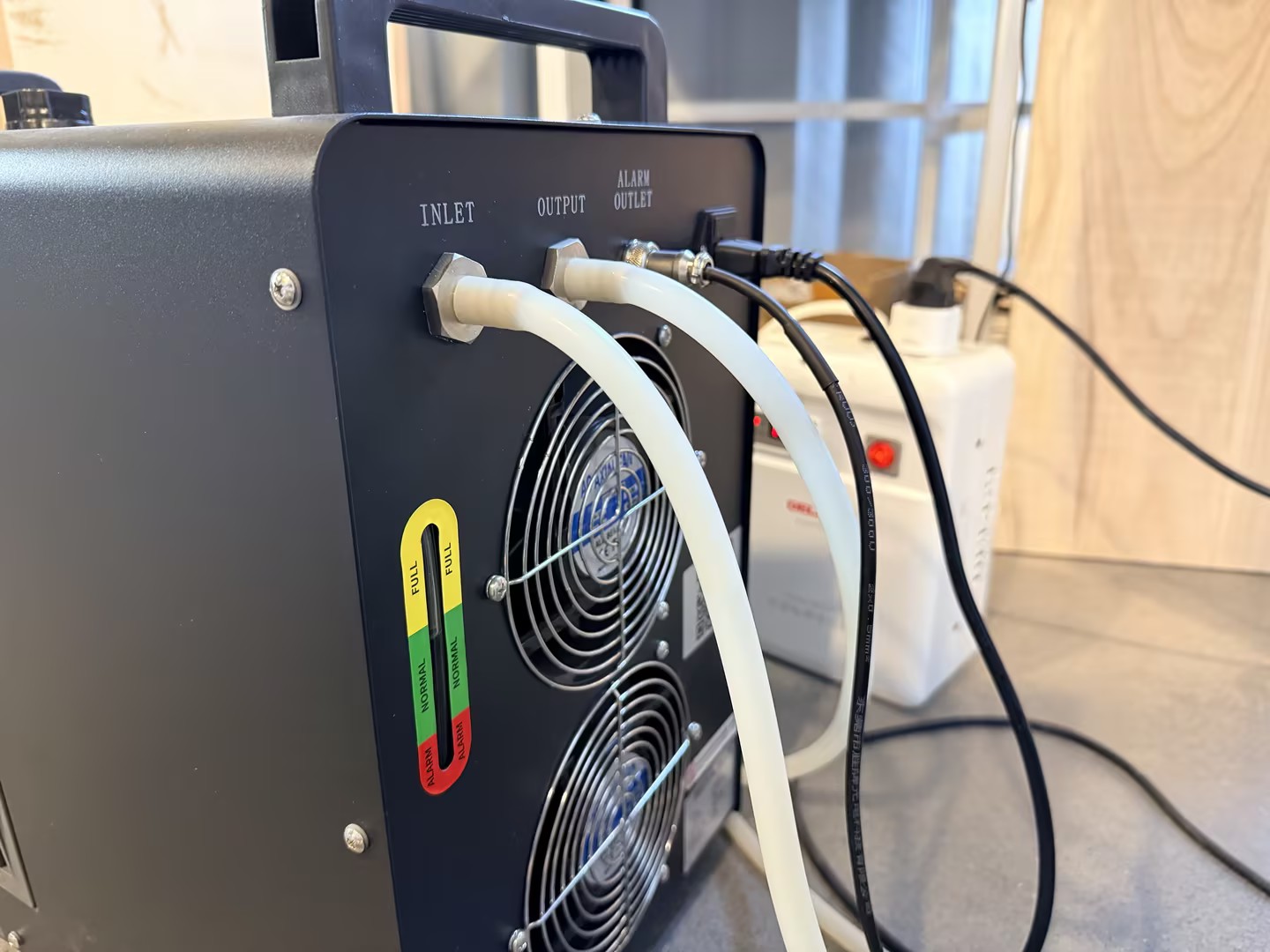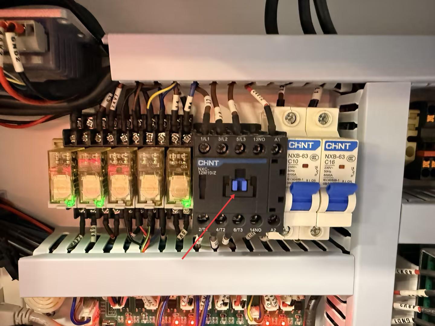 When connecting the chiller to the machine and powering on the system, the chiller remains unpowered. After the laser head completes its reset process, the blue button on the AC Contactor is not engaged as it should be.