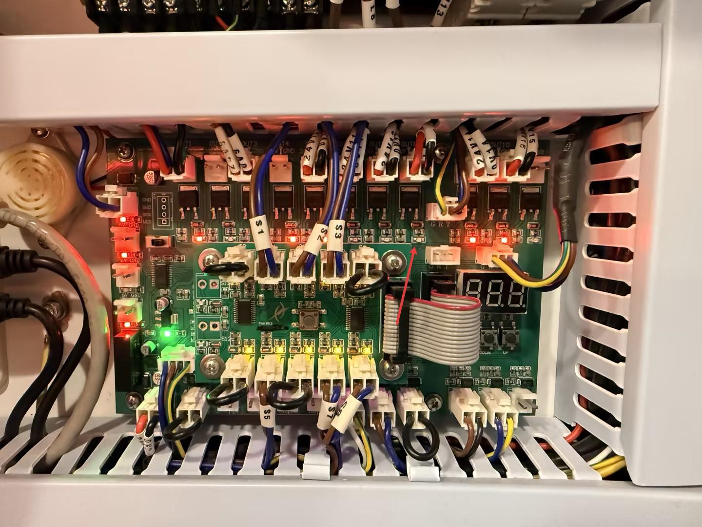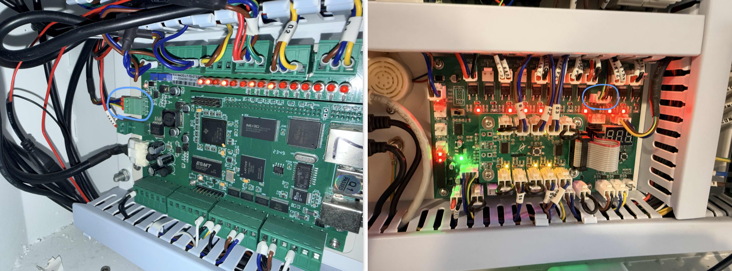 Check the connection cable between the Ruida motherboard and the TL-Timer board (the ports circled in blue) and look for loose plugs or disconnected wires. Then check if the wire insulation was stripped too long or too short, preventing proper contact inside the terminal. Re-seat the wires if necessary.