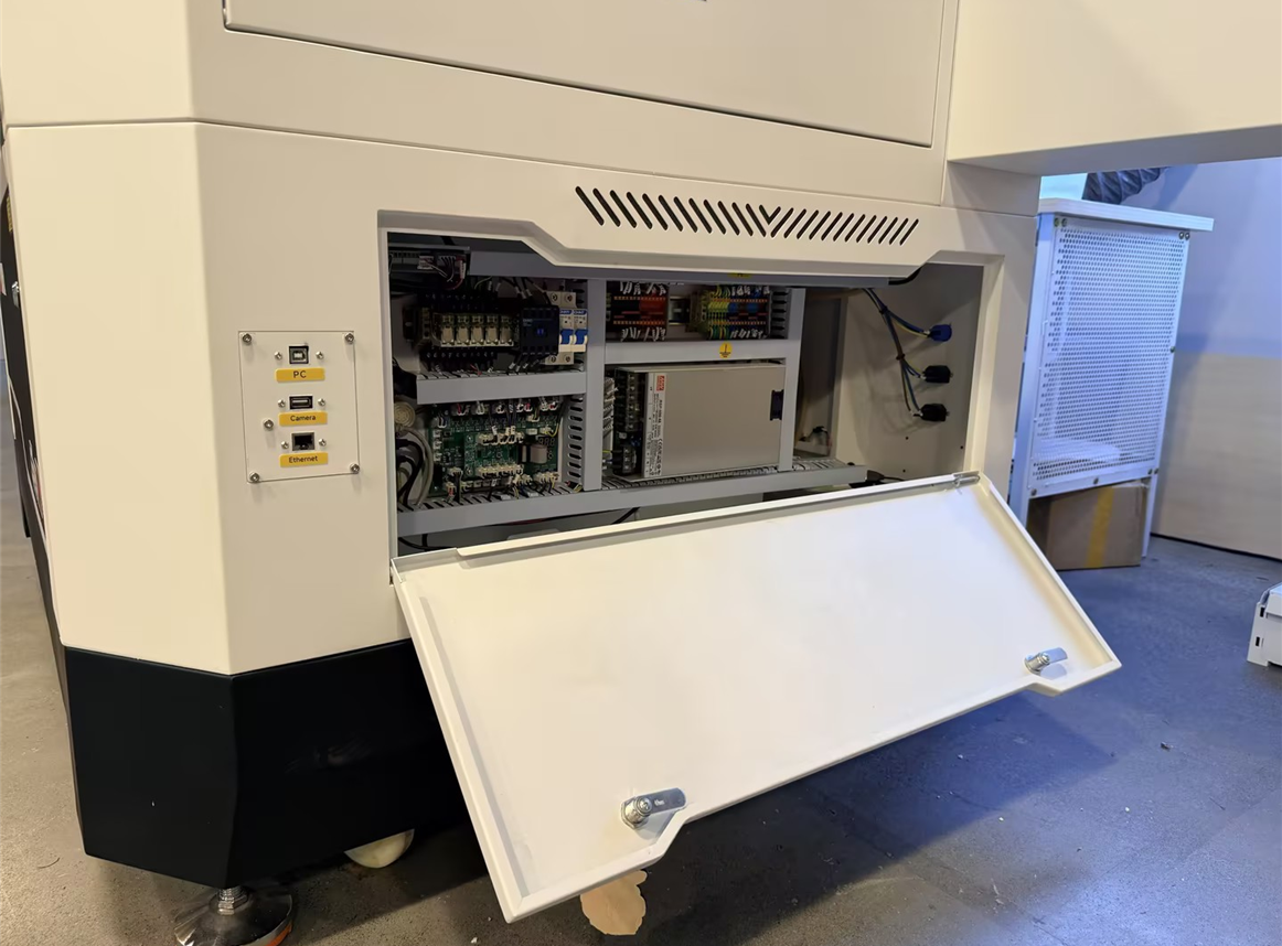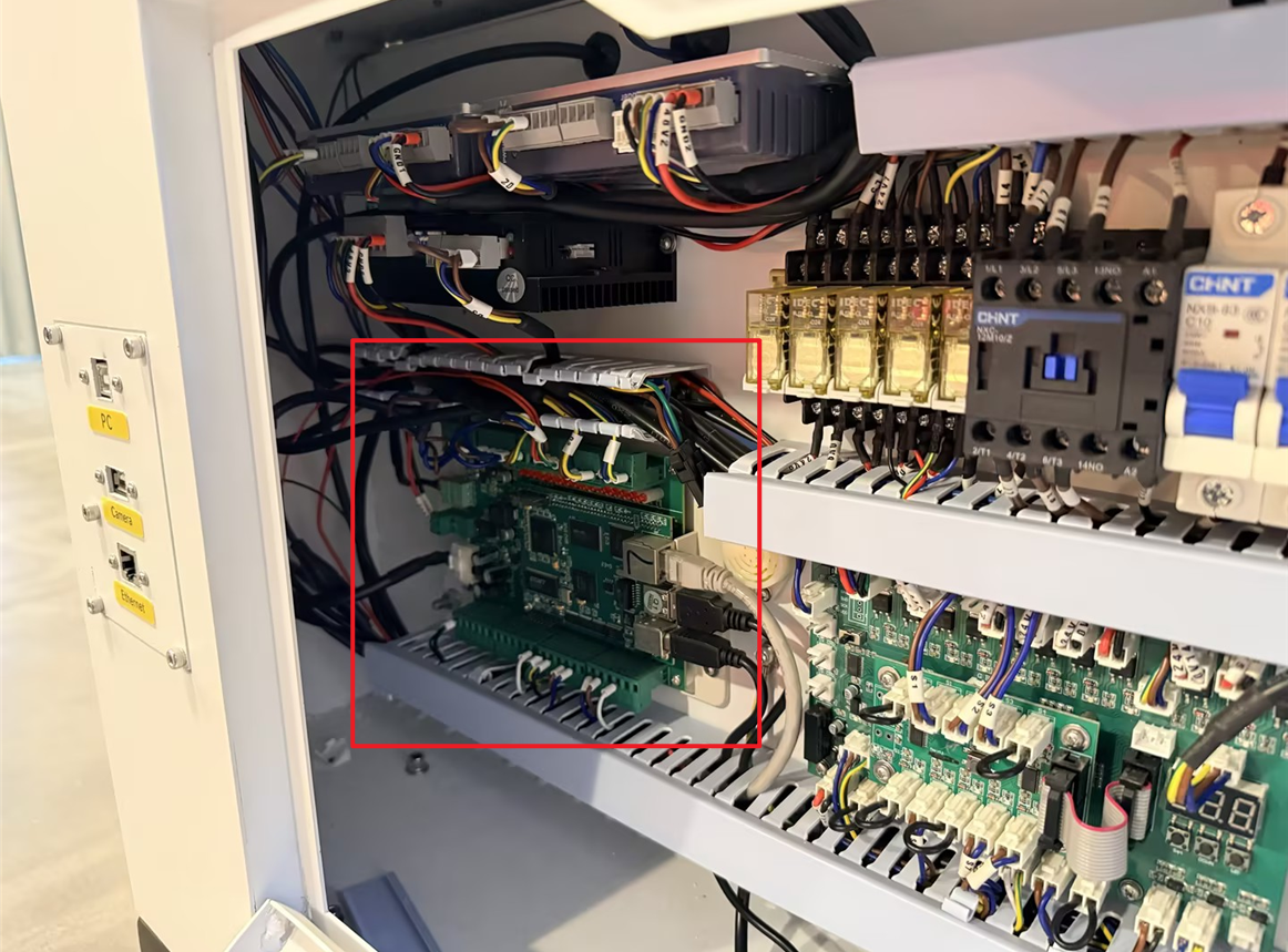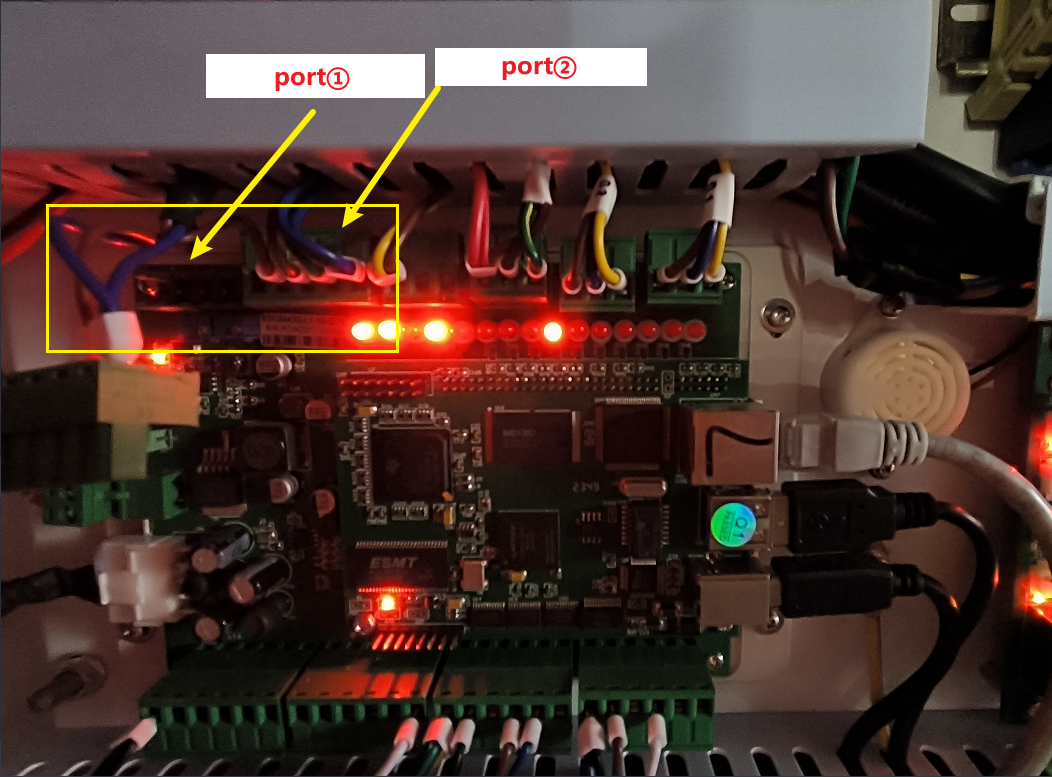 Open the bottom door panel on the right side of the machine to access the controller. Check if the terminals are connected correctly according to the wiring diagram.