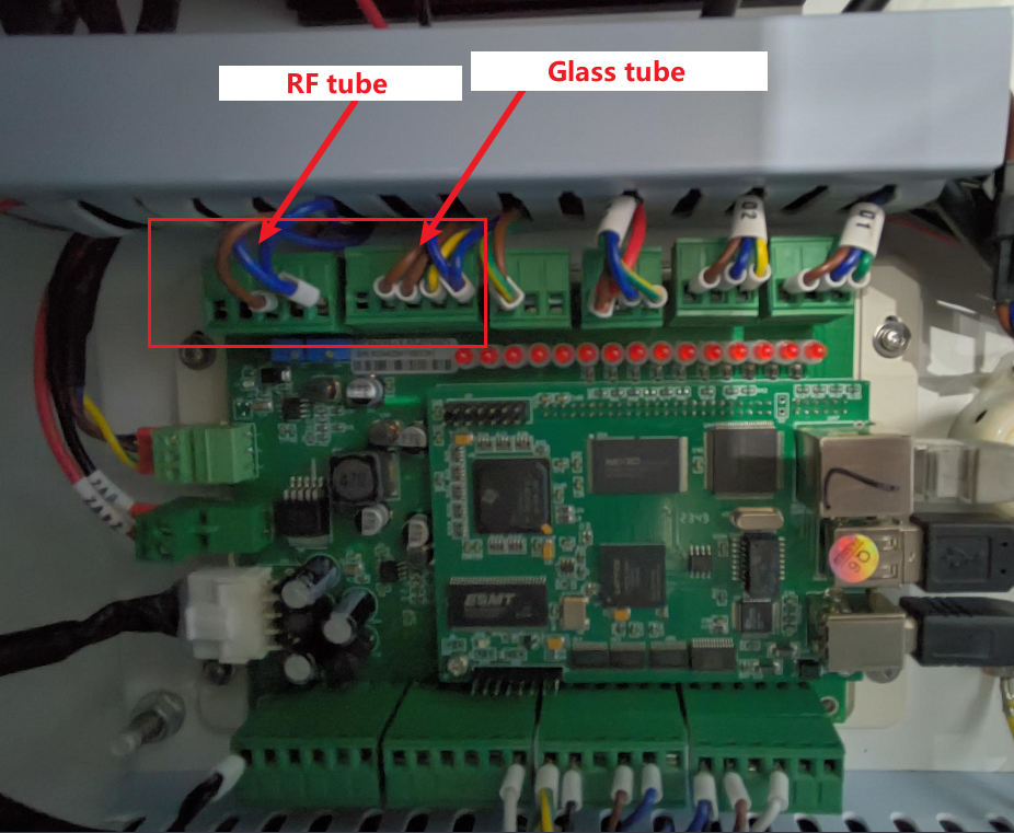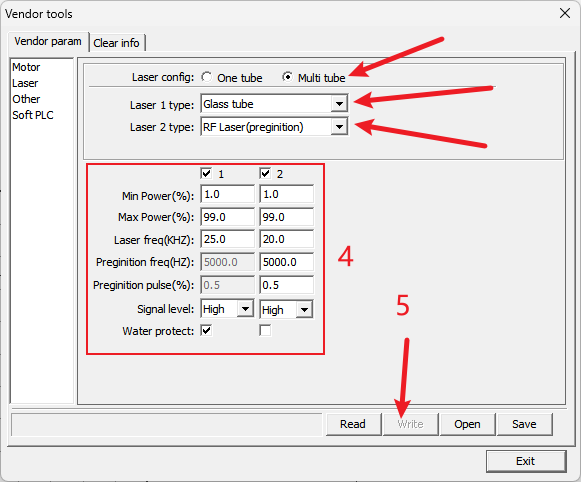 Verify that Laser Type 1 is Glass Tube and Laser Type 2 is RF Tube CO2 (Pre-combustion). The switch signal level must be set to High.