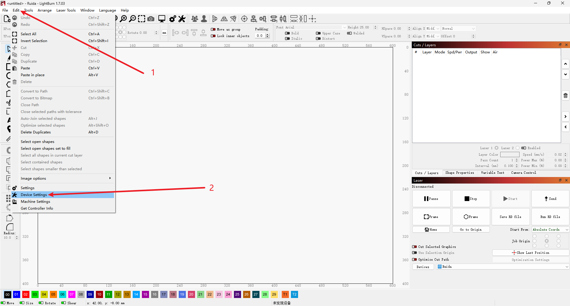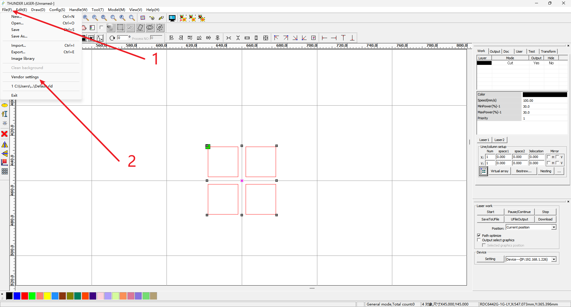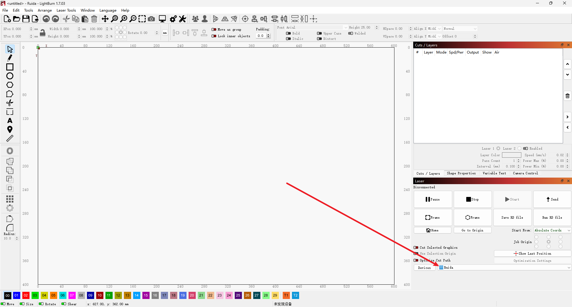 This step can only be completed using the customized version of RDWorks. LightBurn does not have this function and cannot complete the initial setup.