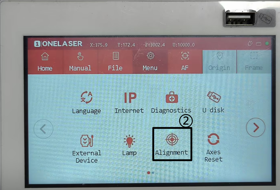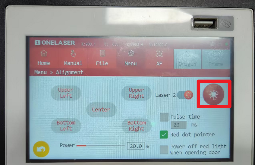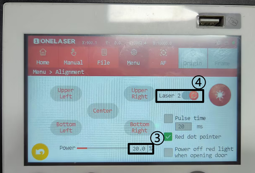 Click Menu→Alignment→Set the burst power to 20%→Click to switch the light source, and the laser ① will switch to the laser ②