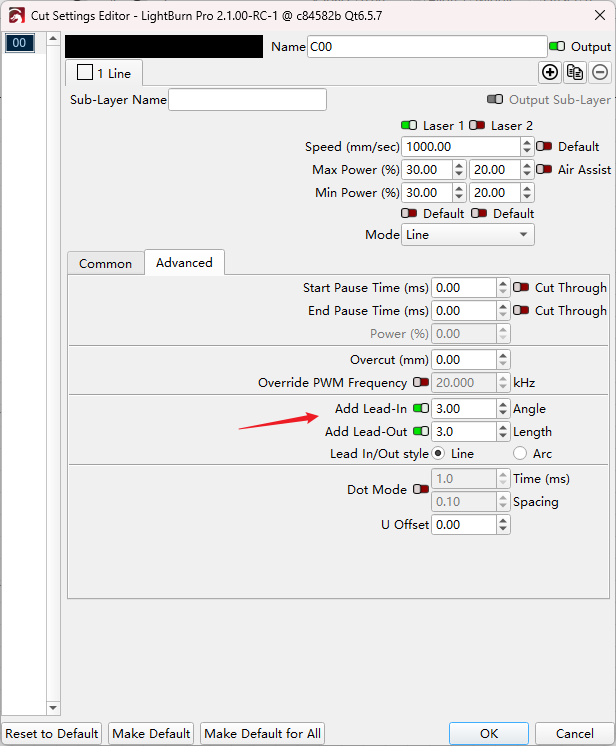Please enable Lead-in and Lead-out in your layer settings. This allows the laser to start firing on a small sacrificial path outside your actual design, ensuring the head is at the correct speed by the time it reaches your cut line.
