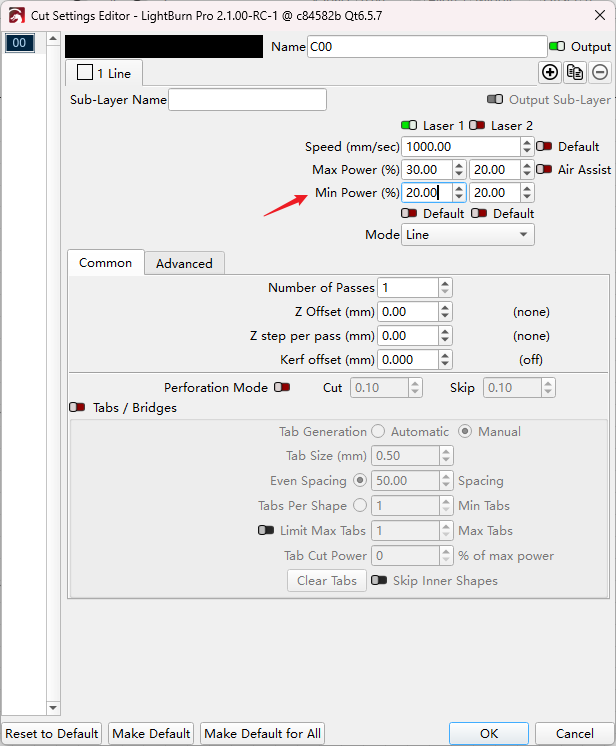 At sharp corners, the controller slows down the laser head. The Min Power setting determines the output during these slower moments.