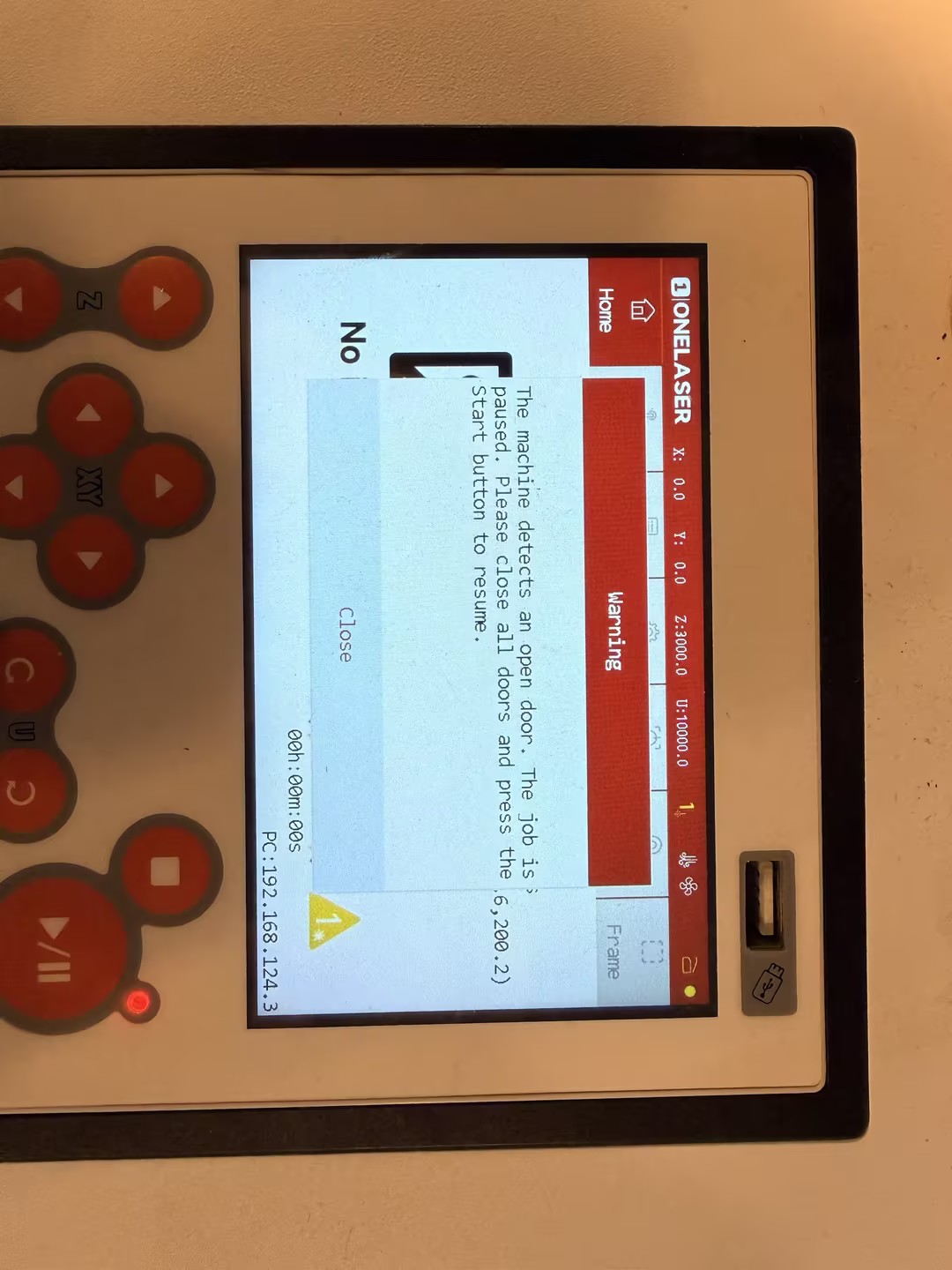 A "Lid Protection" warning appears on the control panel when starting a job or mid-process, causing the machine to stop. The alarm persists even after clicking continue, restarting the job, or rebooting the machine.