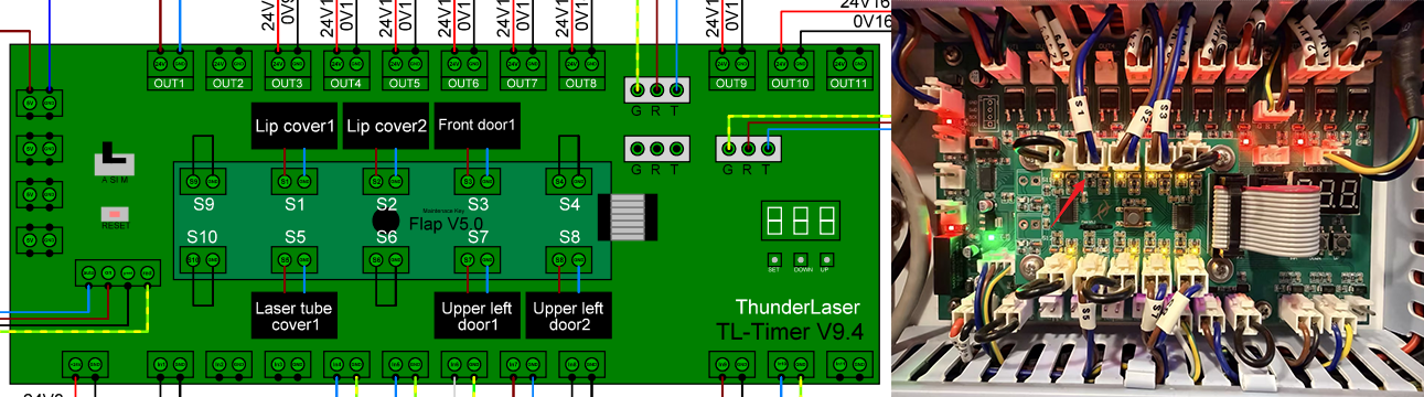 Open the bottom-right door panel to access the TL-Timer board. Observe the status LEDs on the board: