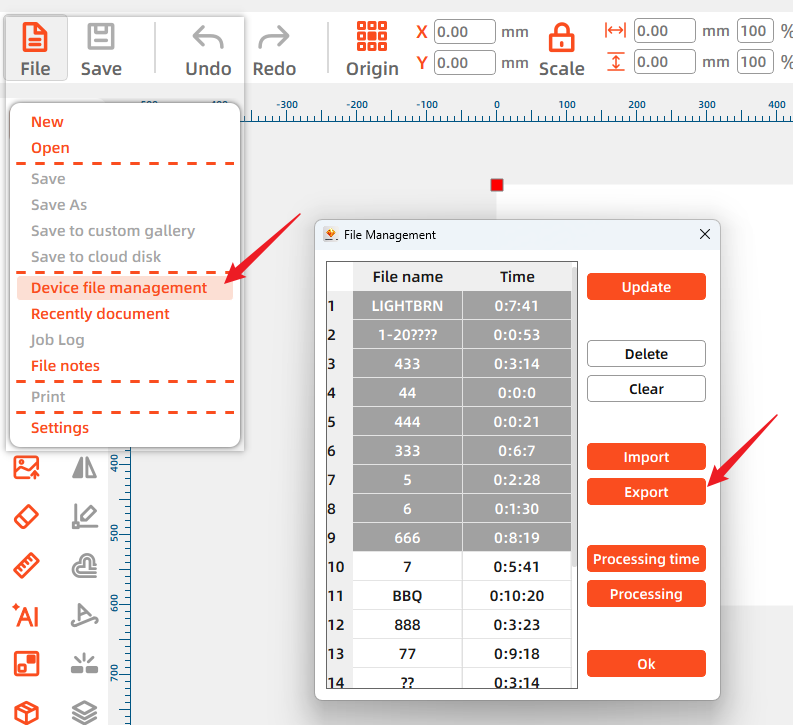 Note: LightBurn does not support exporting files stored in the machine’s memory.