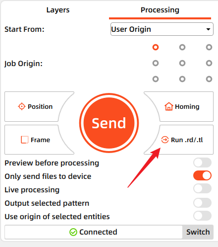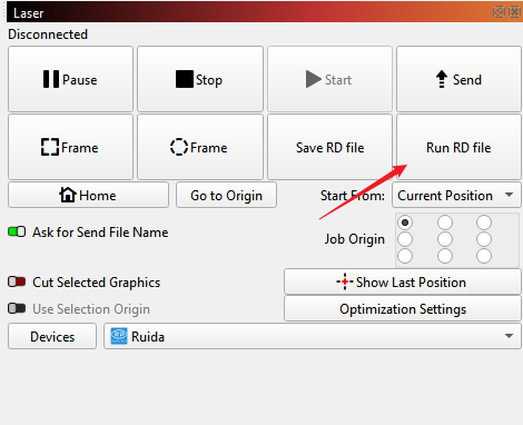 Important: Please be aware that LightBurn’s parsing of .rd files may result in line distortion or errors. Once opened, .rd files can be directly run and processed through LightBurn.
