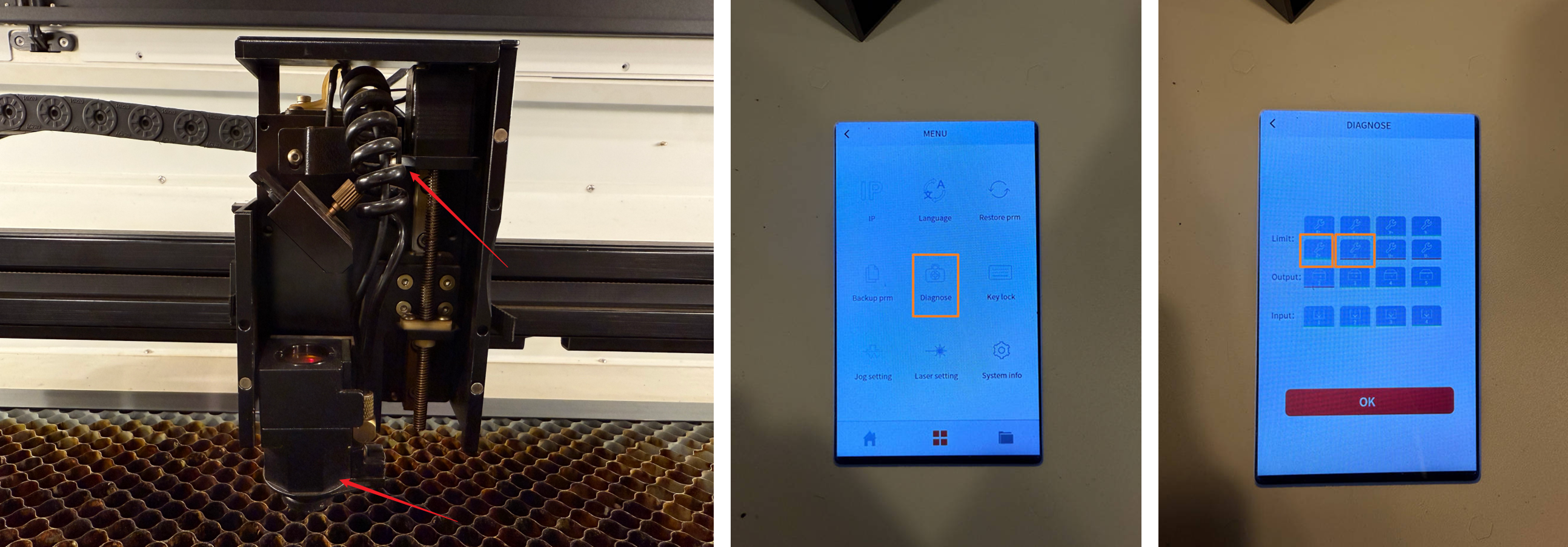 Manually press the laser nozzle or the sensor, and the Z-axis upper limit switch.