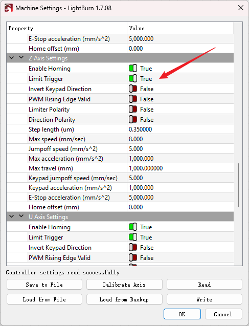In the Z axis settings section, check if the Limit Trigger is disabled. If it is, re-enable it.