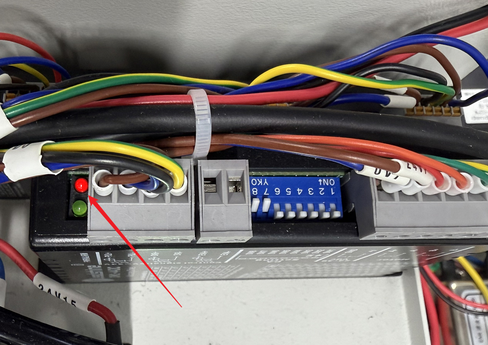 Remove the right-side cover panel to locate the axis drivers. Under normal operating conditions, the status indicator light on the driver should be solid green. If the red indicator light begins to flash, it indicates an abnormality with the driver or motor position.