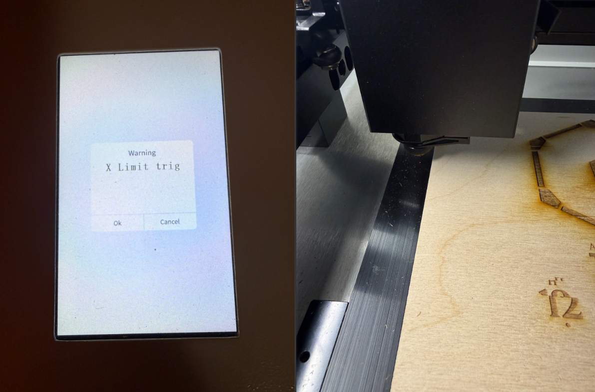 When moving the laser head back to the origin via the control panel, it overtravels and triggers a limit alarm. Conversely, when moving right, the head stops moving before it physically reaches the right-side limit.