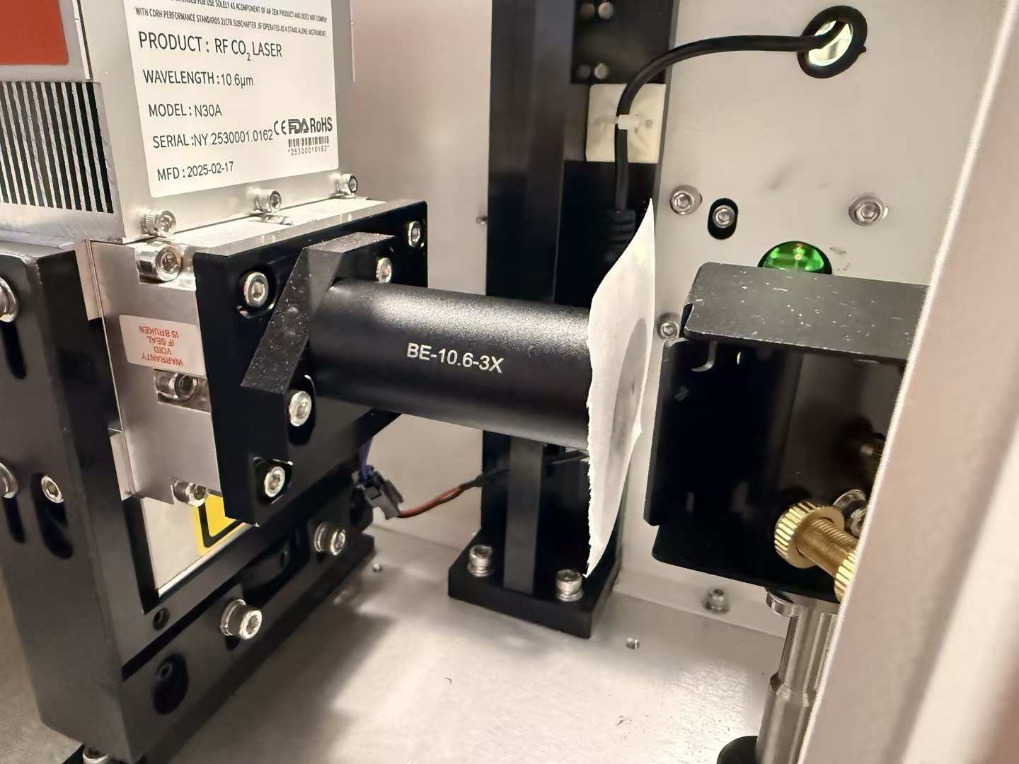 After replacement, place masking tape over the exit of the beam expander housing. Pulse the laser to ensure the spot is singular and centered.