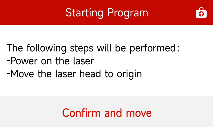 Rotate the safety key switch to the ON position. Then press "Confirm and Move" on the touchscreen control panel. The system will initiate the homing procedure. Upon completion, the home screen will display indicating the system is ready for operation.