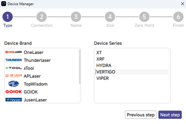 Then follow instructions to complete the connection steps step by step. Critical: Under Controller Type dropdown, MUST select "Ruida". The entered IP MUST exactly match the Hydra Gen 2's configured address.