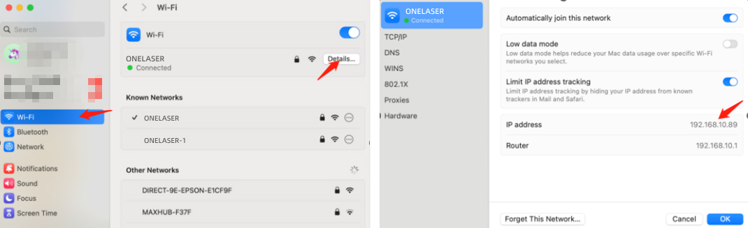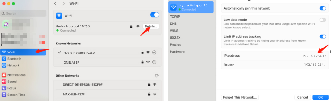 ②Open WiFi settings, view network details, and locate "IP address".