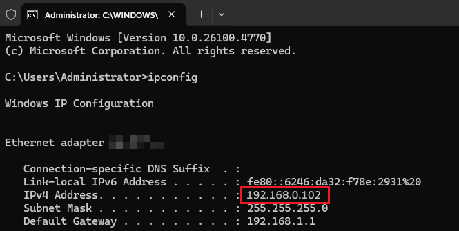 ①Windows: Open Command Prompt, type "ipconfig", and check the IPv4 address.