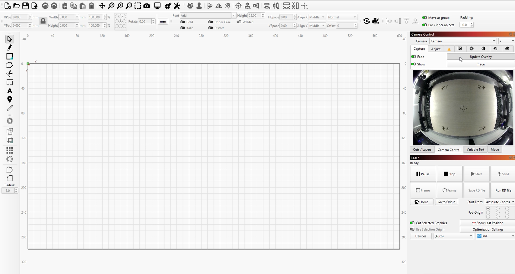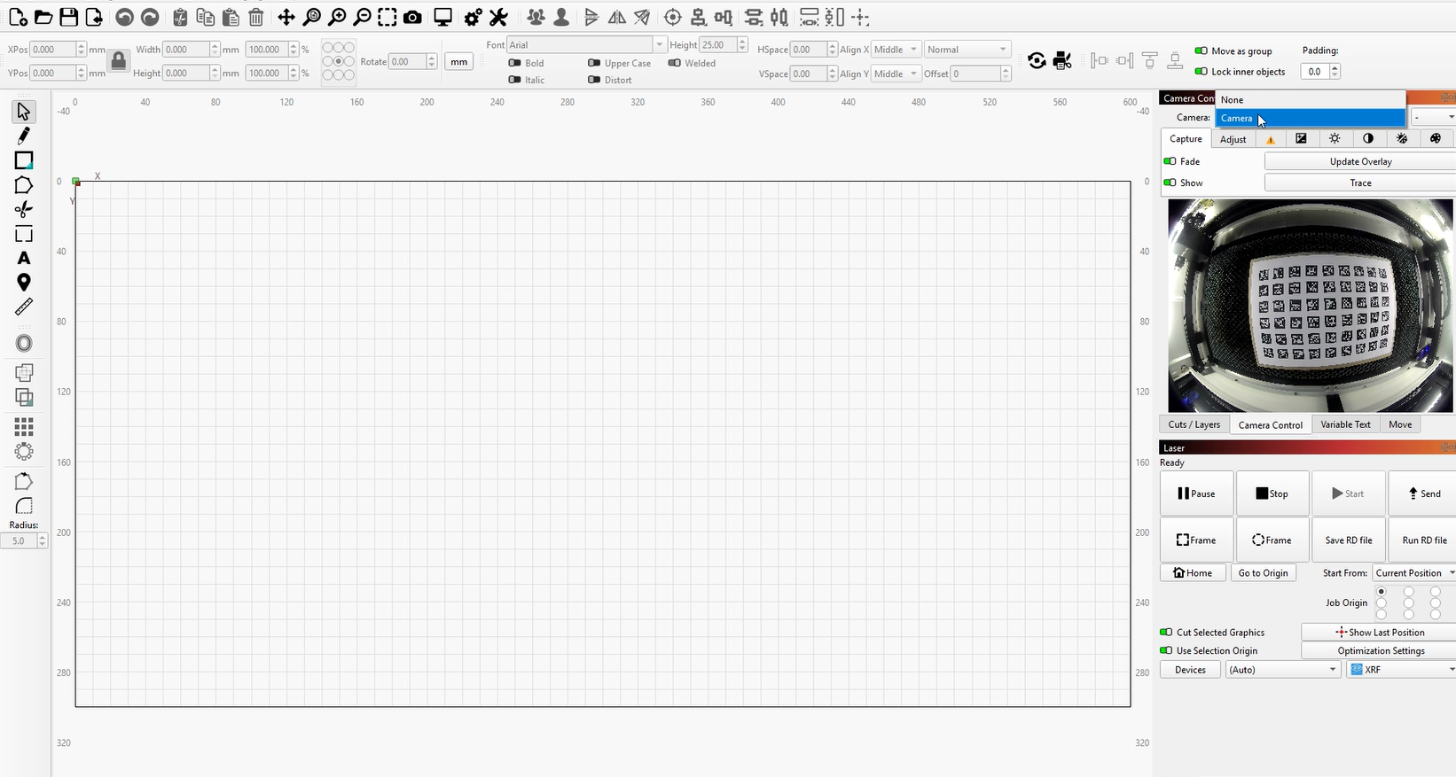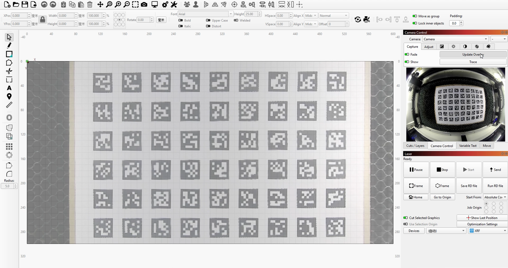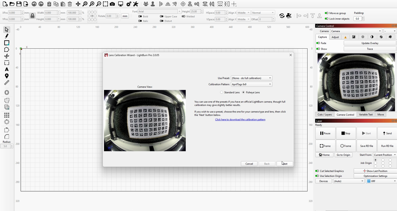 OneLaser machines are preloaded with corresponding camera calibration files at the factory. You can find these files on the USB drive included with the machine and import them into LightBurn for normal use.