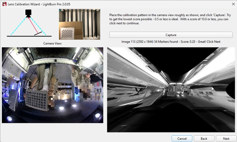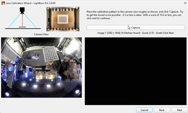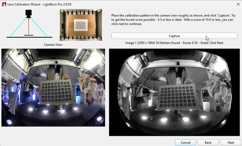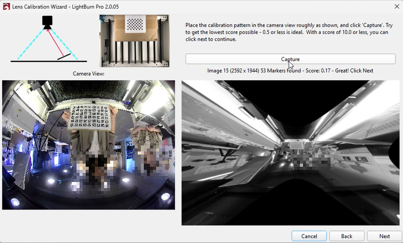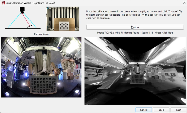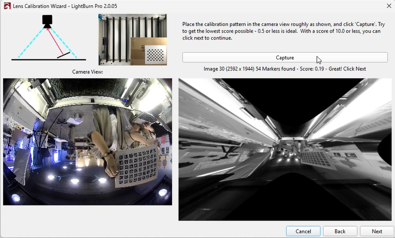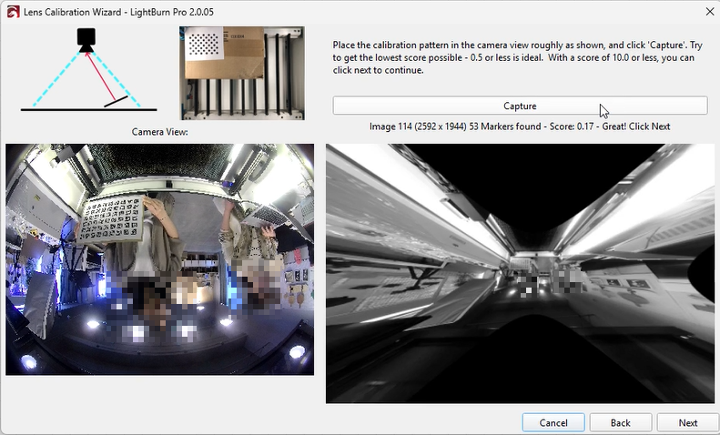 Select the appropriate preset and choose the fisheye camera, then click “Next.” The interface will update, showing a Capture button and placement instructions.