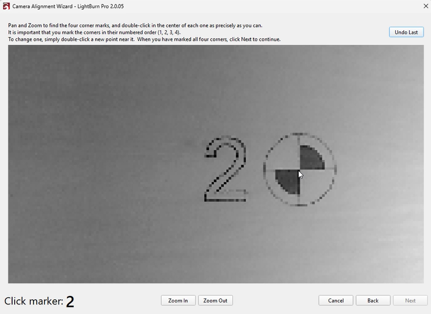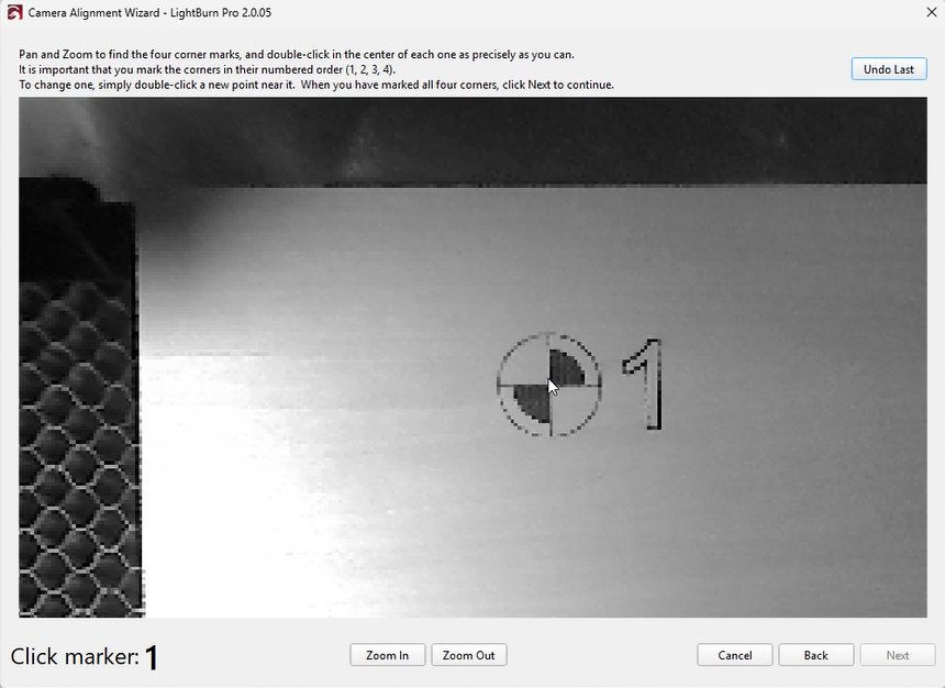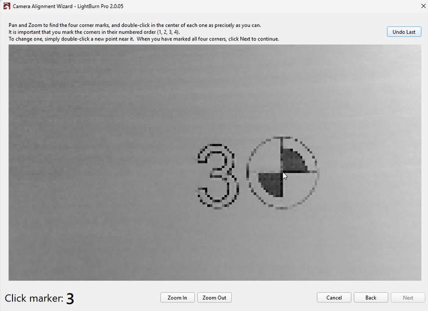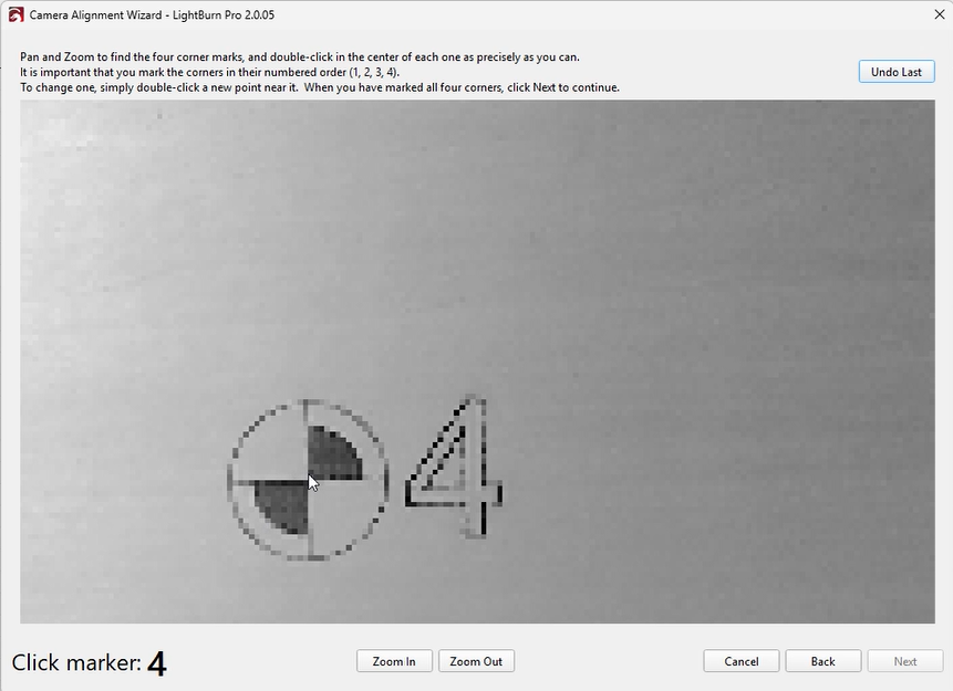 A red “+” marker will appear after each double-click.Place markers in order (1, 2, 3, 4) at the center of each target. If a marker is misplaced, double-click near it to reposition or click “Undo Last” to remove it.