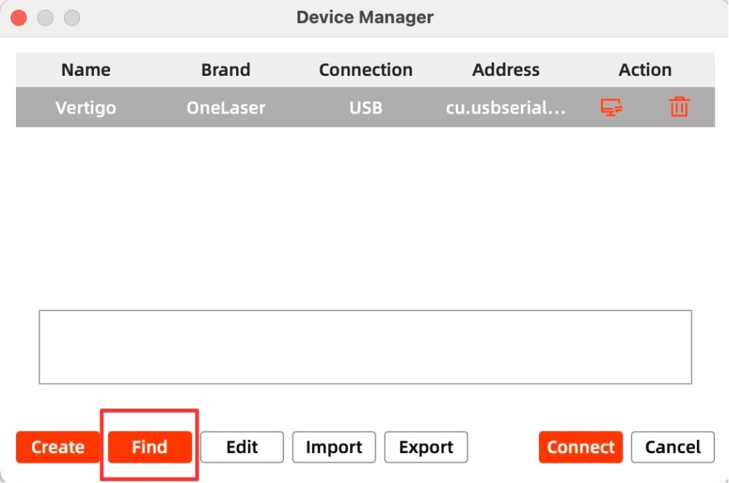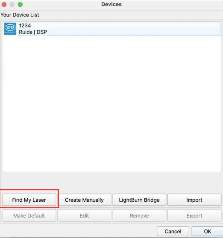 Click "Devices" from right bottom corner of the software. Click "Find My Laser" to set up by the Devices setting.
