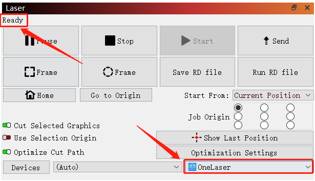Then follow instructions to complete the connection steps step by step. Select the connection you just created and the display shows "Ready" to indicate a successful connection. Now Lightburn communicates with your laser machine via USB cable or Ethernet cable.