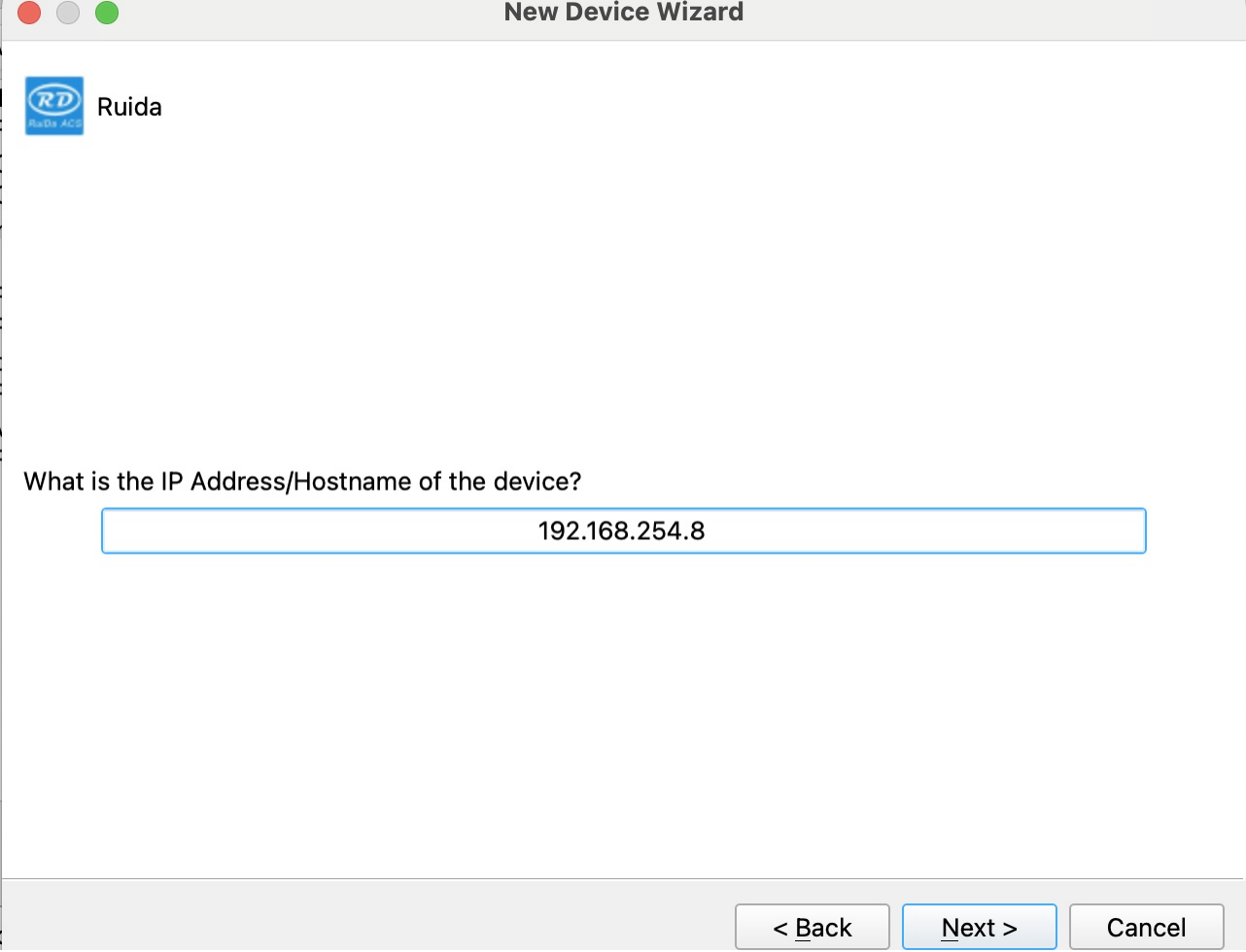 Critical: Under Controller Type dropdown, MUST select "Ruida". The entered IP MUST exactly match the VertiGo's configured address.