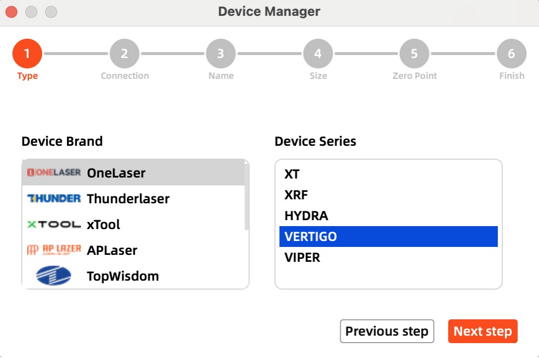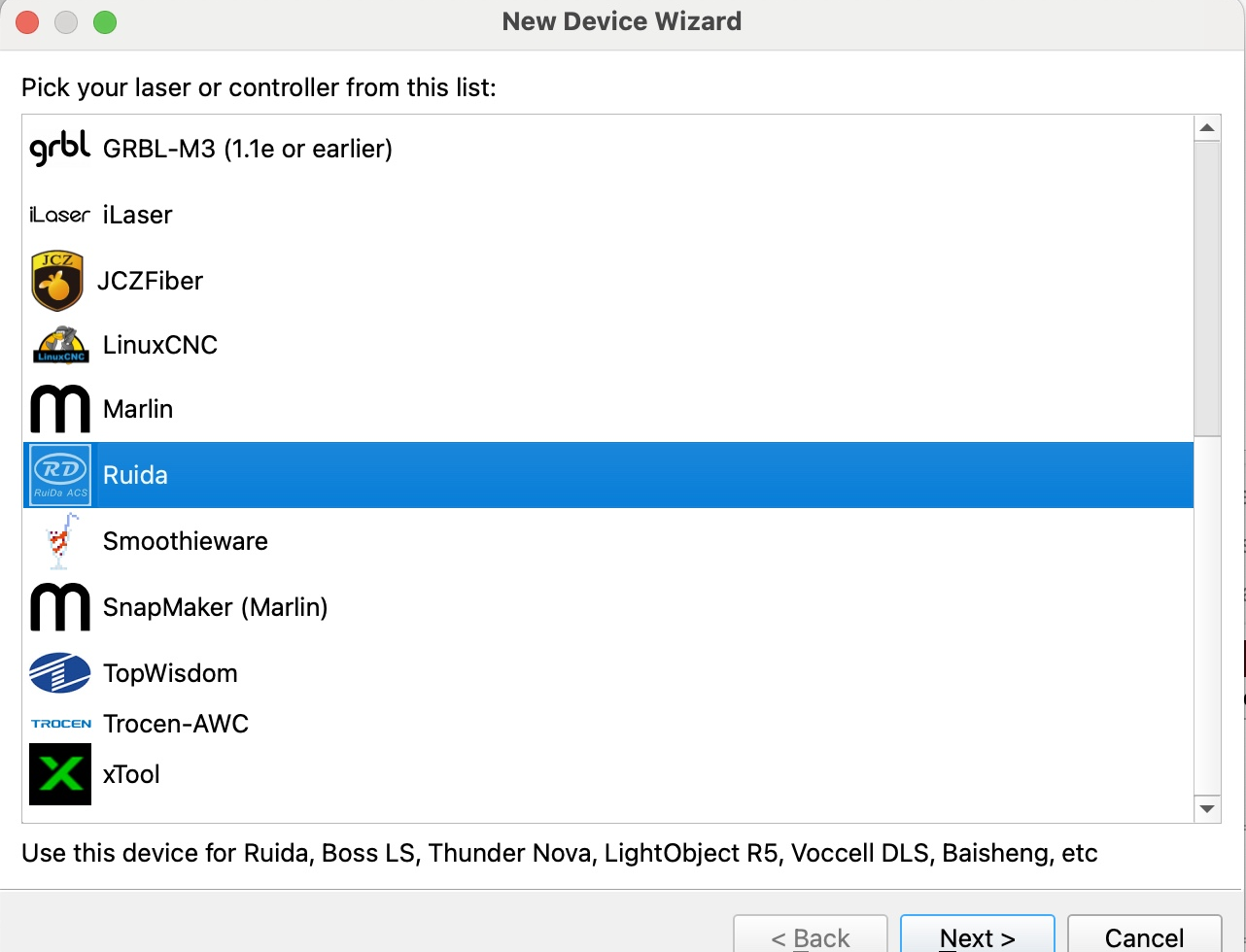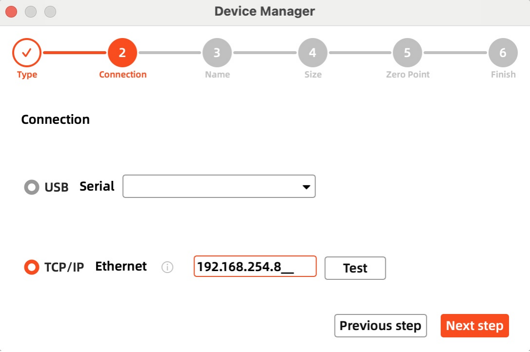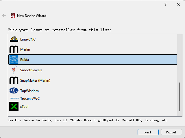 Then follow instructions to complete the connection steps step by step. Critical: Under Controller Type dropdown, MUST select "Ruida". The entered IP MUST exactly match the VertiGo's configured address.