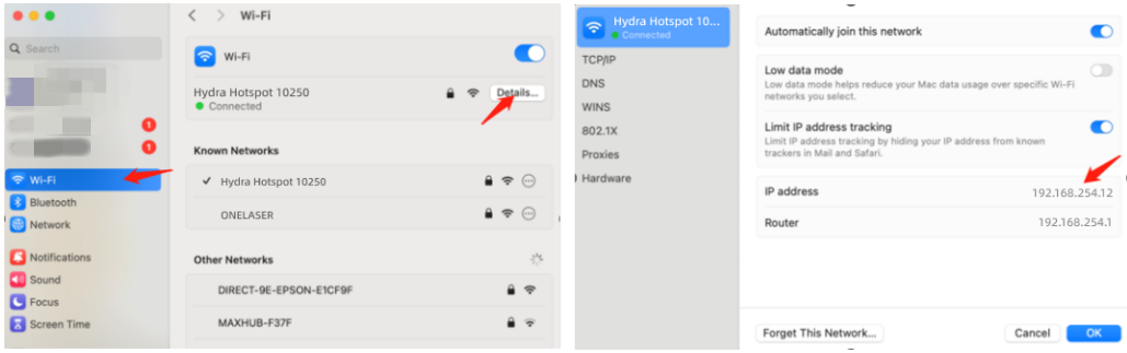 ②Open WiFi settings, view network details, and locate "IP address".