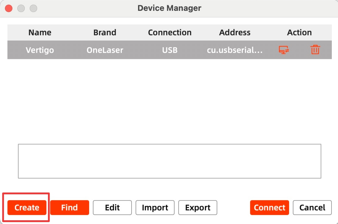 After successful device creation, select the newly created "VertiGo" entry in the machine list. Then click the "Connect" button. The software will instantly activate the connection.