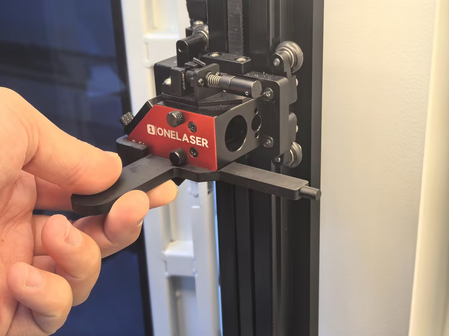 2.Insert the manual focusing tool along the lower surface of the laser head and align it with the edge protrusion.