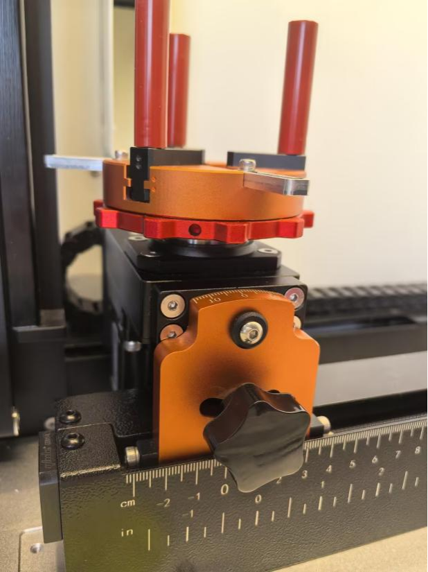 3.Use the on-screen controls to move the workpiece to the right along the F-axis until the distance between the 0° mark on the VertiGo angle marking plate and the 0 cm mark on the bottom F-axis equals the radius of the workpiece.